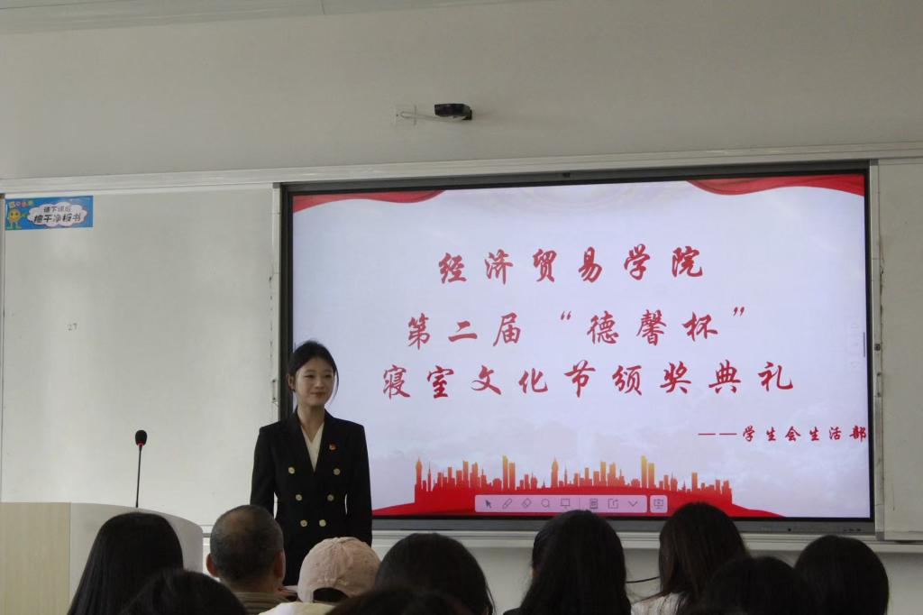 为丰富校园精神文化内涵,打造文明有序、充满活力的寝室生活环境,经济贸易学院于2025年9月17日至11月20日成功举办了第二届“德馨杯”寝室文化节。11月26日下午,学院在洙泗学馆423教室举行颁奖仪式,经济贸易学院党总支书记熊水金、团总支书记喻杨慧出席并为获奖寝室颁奖。
