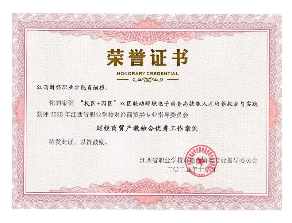 肖细根院长“校区+园区”双区联动跨境电子商务高技能人才培养探索与实践案例获评2025年江西省职业学校财经商贸类专业指导委员会财经商贸产教融合优秀工作案例。