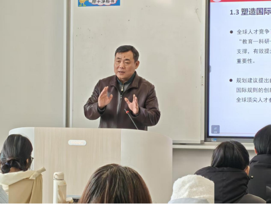 课上,阙沪平围绕党的二十届四中全会精神,从战略意义、理论逻辑、现实挑战、实践路径四个维度展开讲解。他指出,教育、科技、人才三位一体协同发展是破解“卡脖子”技术难题的根本路径,是实现高质量发展的内生动力,更是塑造国际竞争新优势的战略选择,党中央的系列部署体现了对三者相互作用规律认识的持续深化。
