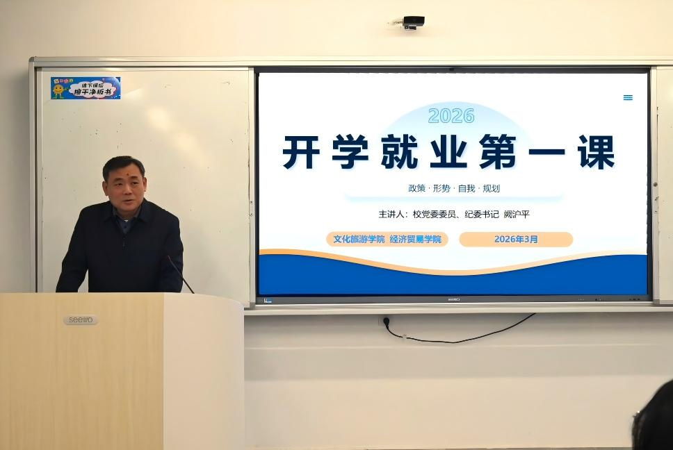 为切实做好2026届毕业生就业工作,帮助学子树立正确就业观、明晰职业规划,3月23日文化旅游学院与经济贸易学院联合开展开学就业第一课,校党委委员、纪委书记阙沪平担任主讲人,为毕业生解读就业政策、分析就业形势、指导职业规划。